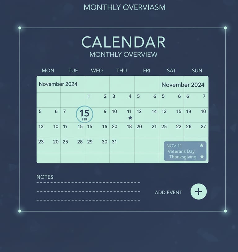 Organiza tus días, añade notas y mantente al tanto de feriados y eventos importantes.